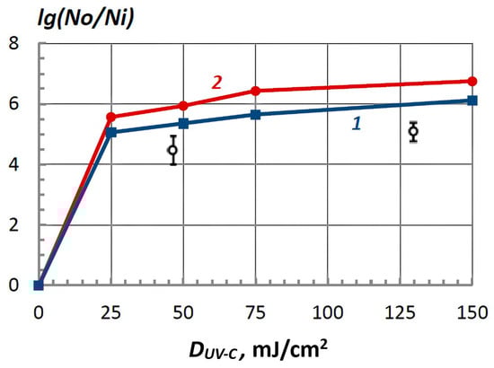Experimental data representing the bactericidal effectiveness of the “Zarnitsa-A” apparatus at various doses of UV-C radiation are shown in Figure 6.