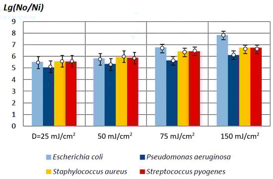The effectiveness of disinfection was determined by calculating the logarithm of inactivation, equal to the decimal logarithm of the ratio of the initial number of microorganisms in the sample () to the number of microorganisms () that survived after irradiation with a dose of . The numerical value of the logarithm of inactivation shows how many decimal orders the initial number of bacteria decreased after treatment with a given energy dose.