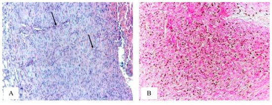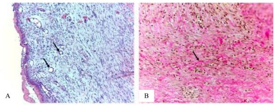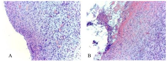 During histological studies, skin samples were fixed in formalin for 2 days. After passing through alcohols of ascending concentrations and chloroform in a Tissue-Tek VIP5Jr apparatus (Sakura Finetek USA, Inc., Torrance, CA, USA), skin fragments were poured into a histomix using a Tissue-Tek TEC device (Sakura Finetek USA, Inc., Torrance, CA, USA); histological sections 5–8 µm thick were prepared on a Microm HM340E microtome (Thermo Scientific, Waltham, MA, USA). The preparations were stained with hematoxylin and eosin according to Van Gieson. Morphological examinations of the skin wounds were performed using a Leica DM2500 microscope (Leica Microsystems, Wetzlar, Germany) at 200× and 400× magnifications.