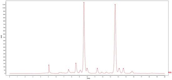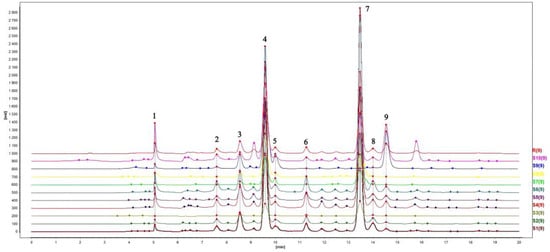 According to reference [], 10 g of S1-S10 Lilium powder (24 mesh sieve) was precisely weighed and placed in a 150 mL conical flask with a stopper. Then, 50 mL of 70% ethanol solution (volume ratio) was added and the ultrasonic duration time was 15 min. The mixture was centrifugated at a speed of 5000 r/min for 10 min. The supernatant was filtered with a microporous membrane of 0.2 μm to provide the test solution. A high-performance liquid chromatography (HPLC) (1260 Infinity II, Agilent Technologies Inc., Santa Clara, CA, USA) fixed with a UV detector and a four-element liquid phase pump was utilized. The mobile phases of the Agilent 5 TC-C18 (2) chromatographic column (250 mm × 4.6 mm, 5 μm) were acetonitrile (A) and 0.1% phosphoric acid solution (B), and a gradient elution was performed within 0–20 min. The mobile phase changed from 20% (A) −80% (B) to 50% (A) −50% (B), and the detection wavelength was 308 nm; the injection volume was 10 μL, and the flow rate was 0.6 mL/min. The chromatograms obtained were analyzed with the software (2012.130723) “Similarity Evaluation System for Chromatographic Fingerprints of Traditional Chinese Medicine” (State Food and Drug Administration, Beijing, China), and the relative peak areas of the common peaks of the ten batches of Lilium fingerprints were analyzed with SPSS 27.0 (IBM, New York, NY, USA) software.