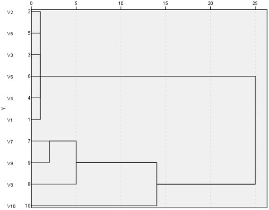 SPSS 27.0 software was used to standardize the relative peak areas of the common peaks of ten batches of Lilium fingerprints. Custer analysis was carried out using the inter-group connection method, where the inter-sample distance was calculated by square Euclidean distance. The results are shown in Figure 3. When a clustering distance of 10 was applied, the data could be grouped into three main categories. The first category included S1, S2, S3, S4, S5, and S6, all of which belong to Lilium lancifolium Thunb. The second category comprised S7, S8, and S9, all of which are classified as Lilium brownii var. Viridulum Baker. The third category consisted of S10, identified as Lilium davidi var. unicdor cotton.