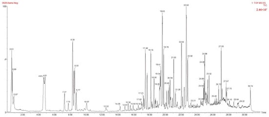 According to the method in Section 2.5, the S9 Lilium sample (Lilium brownii var. Viridulum Baker) was detected, and the ion flow diagrams of the Lilium sample in positive and negative ion modes were obtained, as shown in Figure 4 and Figure 5, respectively. Through the analysis of the precise relative molecular weight of the primary mass spectrometry and the cleavage information of the secondary mass spectrometry, identification and speculation were conducted in combination with the literature, as shown in Table 5 and Table 6. According to the data analysis method, a total of 70 compounds were speculated, including 22 phenolic compounds, 41 steroidal saponins, 6 alkaloids, and 1 flavonoid. The identification results are shown in Table 5 and Table 6.