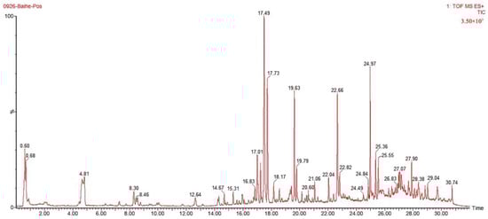 According to reference [], the sample test solution was prepared using the same method as Section 2.4. The ultra-performance liquid chromatography-mass spectrometry chromatograph (ACQUITY UPLC I—Class Xevo G2-S QTof MS, Waters Technology Co., Ltd., Milford, MA, USA) was used. The chromatography was performed on Waters Acquity UPLC BEH C18 column (2.1 mm × 50 mm, 1.7 μm) with a mobile phase of acetonitrile (A) −0.1% formic acid aqueous solution (B), gradient elution (0–2 min, 3% A; 2–6 min, 3–10% A; 6–9 min, 10–15% A; 9–12 min, 15% A; 12–16 min, 15–25% A; 16–18 min, 25–30% A; 18–22 min, 30–40% A; 22–25 min, 40–80% A; 25–27 min, 80–95% A; 27–30 min, 95% A; 30–36 min, 3% A), a column temperature of 35 °C, a flow rate of 0.3 mL/min, and an injection volume of 5 μL. The mass spectrum conditions were an electrospray ion source; the scanning range of the positive and negative ion detection mode was m/z 100–1200; the capillary voltage was 3.0 kV for the positive ion, 2.5 kV for the negative ion; the nozzle voltage was 40 V; the dry gas flow rate was 800 L/h; the ion source temperature was 120 °C; the collision gas was argon and the collision energy was 20–40 eV; and the experimental data were corrected in real-time using the Lock Mass pathway.
