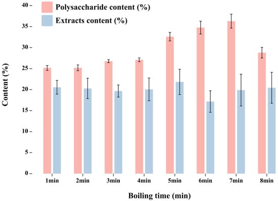 In the process of Lilium processing, the Lilium scales need to be cooked, but not gelatinized. According to observation, there was no significant change in the Lilium scales after boiling for 1–2 min. After boiling for 3–4 min, there were slight cracks on the Lilium scales. After boiling for 5–7 min, the cross-section of Lilium scales appeared pink. After boiling for 8 min, the Lilium scales were fully cooked, with a powdery cross-section that was easy to crush. Over 8 min, the Lilium scales were completely gelatinized. Therefore, the boiling time range was selected from 1 to 8 min. According to the method in Section 2.6, the polysaccharide and extract contents of fresh Lilium S9 were tested at different boiling times, as shown in Figure 6. The influence of boiling time on the quality of Lilium was evaluated according to two indicators: extract and polysaccharide contents.
