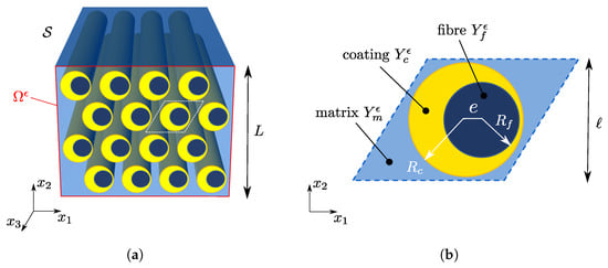 Let us consider a linear elastic solid , endowed with two-dimensional periodicity, in the plane , composed by a matrix (m) with coated cylindrical inclusions (or fibers, f). The internal fiber has an eccentricity e with respect the external coating (c) as shown in Figure 1. The in-plane periodicity of the cylindrical body allows us to study the problem under plane strain conditions. For this purpose, let be the section of with the plane ; it can be obtained by the periodic repetition of the unit cell depicted in Figure 1b, and let be the macroscopic in-plane position vector.