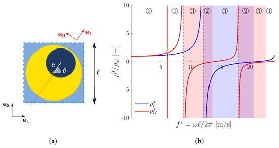 where and are the corresponding eigenvalues, i.e., the principal mass densities. As it can be observed by looking at Equations (14) and (15), the contribution that the matrix provides to the mass tensor is always isotropic. This means that the source of anisotropy is related to the inclusion only. For the assumed geometry, the line connecting the centers of the fiber and of the coating (red dotted line in Figure 2a) is a symmetry axis of the coated inclusion, i.e., it is a principal direction of mass that we identify with . The other one, , is defined by the direction orthogonal to .
