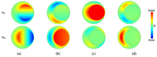 The eigenmodes are shown in Figure 3 in the case of the horizontally eccentric fiber (), which means is parallel to and is parallel to . The eigenmodes shown in Figure 3a,b,d are orthogonal with respect to but not with respect to . This is why only has three vertical asymptotes at the reduced frequencies and m/s. Conversely, the eigenmode shown in Figure 3c is orthogonal with respect to but not with respect to , which implies that only has a vertical asymptote for m/s.