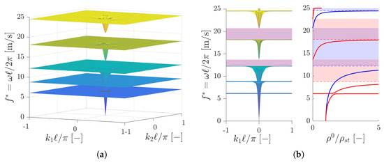 The purple-shaded regions of Figure 2b, i.e., the superposition of the blue and red ones, correspond to the band gaps of the locally resonant metamaterial. To validate this result, we performed a Bloch–Floquet numerical analysis on the same metamaterial considered in Figure 2. The resulting dispersion surfaces are shown in Figure 4b on the whole First Brillouin Zone of the lattice, which in this case is a square of side .
