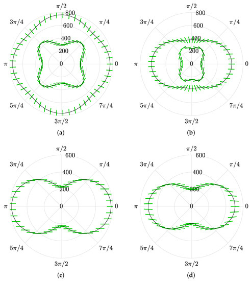 Polar diagrams of effective wave phase velocity (in black), expressed in m/s, as a function of the propagation direction for different values of frequency. Green segments give the polarization directions; (a) m/s; (b) m/s; (c) m/s; (d) m/s.