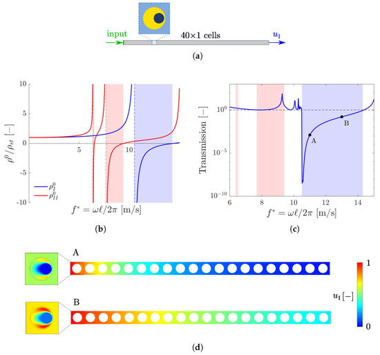 Transmission analysis with : (a) model for the transmission; (b) principal values of the homogenized mass; (c) —transmission as a function of frequency; (d) contour of in the first twenty cells for: (A) m/s and (B) m/s.