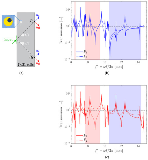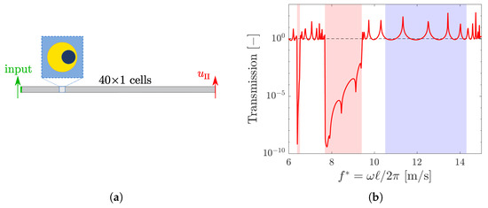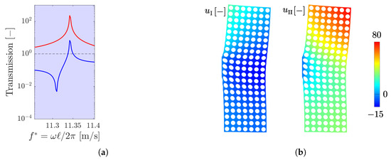 We also consider the transmission, on the same system, of a unit displacement in the direction, as illustrated in Figure 7a. The response of the array is evaluated in terms of the displacement of the right edge of the array, and the transmission is plotted in Figure 7b. Since the propagating waves are polarized in the direction, the absorption is now present in the red polarization bands only, i.e., when is negative.