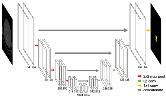 The U-net [25] is a kind of convolution network using an autoencoder for semantic segmentation. Figure 3 shows the U-net architecture we applied. The first half of the U-shaped network is an encoder, and the second half is a decoder. The encoder consists of convolution layers and pooling layers, which repeatedly perform two 3 × 3 convolutions, each followed by a rectified linear unit (ReLU) and a 2 × 2 max pooling with stride 2 for downsampling. The number of feature maps increases as the layers get deeper, with the deepest layer having 1024 feature maps. The decoder consists of deconvolution layers and upconvolution layers with a 2 × 2 upsampling and two 3 × 3 convolutions, each followed by a ReLU. The feature maps of the encoder part at the same depth are concatenated with the feature maps obtained by upsampling, and a convolution is performed. The last layer performs a 1 × 1 convolution and assigns a class to each pixel. It uses skip connections to combine the high-level semantic feature maps from the decoder and corresponding low-level detailed feature maps from the encoder. Due to the skip connection and the relatively small network described above, the U-net approach is often used in medical image segmentation.