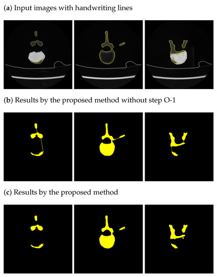 Figure 4 shows the results of the proposed GT generator using our semi-automatic method. Due to paper-length limitations, only the results for the artificial bone are presented here. Figure 4a shows the input images, and Figure 4b,c show the results of the proposed method without steps 0–1 and the proposed method, respectively. We found that while the borderlines of Figure 4b were connected to each other, the borderlines of Figure 4c were correctively divided into parts, thanks to DBSCAN. Handwritten GT lines are often not closed and cannot be filled with GT color, resulting in rewrites, and it takes 10 min per image by an experienced annotator (>2 years). However, the proposed method automatically generated GT images filled with the GT color and only took 43 s to generate 86 images using an ordinary Apple M1 3.20 GHz processor computer with 16 GB of memory. The generated GTs were verified by experienced persons (>2 years) who confirmed that the GTs were the same as the GTs made by experienced persons. From these results, we could verify that the proposed semi-automatic GT generation worked effectively from handwriting lines and could reduce time-consuming GT-generation tasks. The proposed method is highly effective when the number of data is large, such as when creating a bone model of the entire body.
