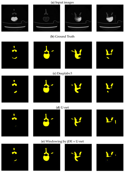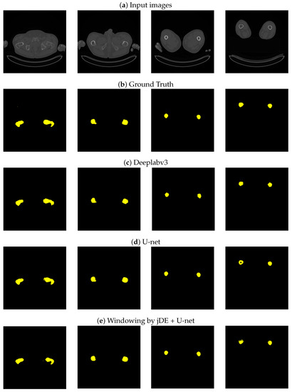 Table 1, Table 2 and Table 3 show the semantic segmentation results in terms of IoU, dice, and pairwise accuracy. As shown in Table 3, we found that the proposed method had the best performance; however, the performance improvement regarding the semantic segmentation was not so apparent because the pairwise accuracy includes the accuracy regarding the background. In Table 1 and Table 2, we observed that there were no clear differences between the results of the U-net, DeepLabv3, and the proposed methods, in terms of the femur. Compared to artificial bone and spine, the femur is a relatively easier-to-extract bone area because its shape is not complex. Therefore, DeepLabv3 worked well even in this experimental condition with a small number of training images. Regarding artificial and spine bones, we verified the proposed method outperformed U-net, thanks to optimizing windowing parameters with jDE. jDE is a stochastic method, but these results were stable. Moreover, we verified that the U-net-based model was better suited than DeepLabv3 under the condition of limited training data, based on these results. The architecture of DeepLabv3 has many more layers than the U-net, so DeepLabv3 needs a lot of training data. Figure 5, Figure 6 and Figure 7 show the segmentation results, and (a), (b), (c), (d), and (e) are the input images, GT images using the proposed method, with the results of Deeplabv3, of the U-net, and of the proposed method, respectively. From Figure 7a, we can see that the white color is not unified in bone areas because the bone contours are denser than those of the inside. Considering the semantic segmentation from the input images, it makes it difficult to extract whole bone parts.