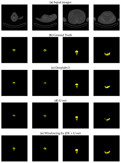 As shown in the left figures in Figure 5 and the right figures in Figure 6, the proposed method, windowing jDE + U-net, could extract more precise areas compared to U-net alone. The proposed method could automatically generate the GT images from handwritten lines and optimize DICOM image parameters for performance improvement. From these results, we could verify that an appropriate windowing parameter generated clearer input images for the U-net model, and the proposed method only needed to solve the easier semantic segmentation problem, thanks to the input images using jDE.