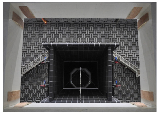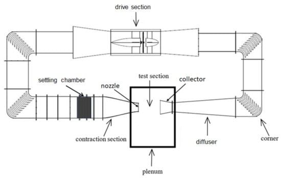 Depending on the configuration of the test section, wind tunnels can be classified into open-jet wind tunnels and closed wind tunnels [1]. The test section of a closed wind tunnel, together with other sections of the tunnel, forms a continuous closed channel. In contrast, an open-jet wind tunnel creates a free jet in front of the test section and uses uniform airflow within the core region for aerodynamic testing. The airflow from the nozzle is directed through a collector into the first diffuser downstream of the test section, as shown in Figure 1. The test section of an open-jet wind tunnel is typically enclosed by a sealed chamber known as a plenum [1,2,3] or test hall [2,4]. The plenum of an open-jet wind tunnel used for acoustic testing is typically equipped with sound-absorbing wedges on its interior walls and is commonly referred to as either an anechoic plenum or a chamber [2].