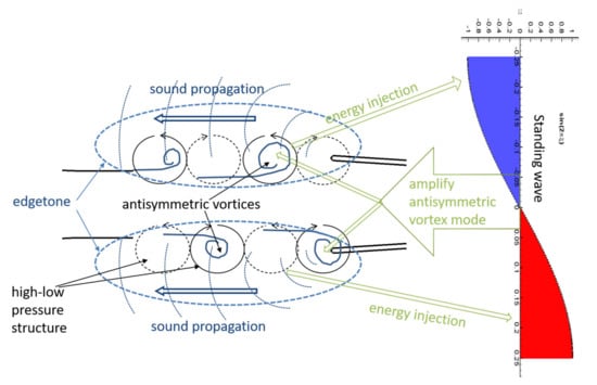 The large-scale vortices on both sides of the jet can exhibit either symmetric or antisymmetric patterns. Jin et al. [22] noted that the resonance between the standing wave and edgetone feedback strengthens the antisymmetric vortex mode. As a result, the antisymmetric vortex mode dominates the edgetone feedback and serves as an energy source for the width-direction standing wave, as illustrated in Figure 3.