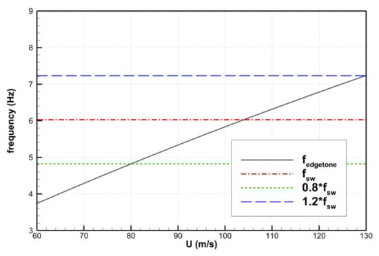 Figure 5 displays the relationship between the edgetone frequency and wind speed according to Equation (2) with external feedback, , and . When the wind speed reaches approximately 80 m/s, the frequency of external edgetone feedback reaches just , indicating entry into the resonance region. These results are consistent with test runs performed in this wind tunnel, where wind speeds approaching 84 m/s caused roof damage, necessitating wind speeds to be limited to below 80 m/s [4]. Therefore, it is highly probable that significant low-frequency pressure fluctuations in DNW-LLF’s open test section are also caused by resonance between edgetone feedback and width-direction planar standing wave in the plenum. In addition, the findings from Figure 5 indicate that low-frequency pressure oscillations in the wind tunnel will likely reach their maximum amplitude at a wind speed of approximately 104 m/s.