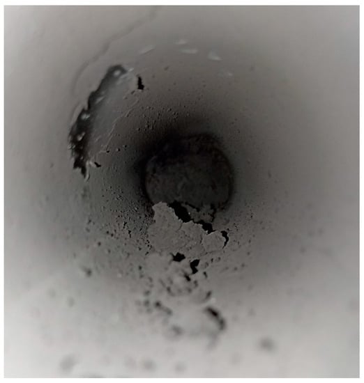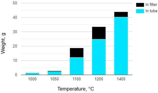 Separate experiments were carried out at 1200 °C for 5 L/min to assess soot formation as a function of methane flow rate. As a result, the amount of soot produced increased by two times, with the bulk of the carbon observed in the tube, as shown in Figure 5. Due to the sintering of soot particles and the formation of build-ups in the reaction zone, the main part of the carbon is not blown out by the gas flow into the filter and accumulates in the tube.