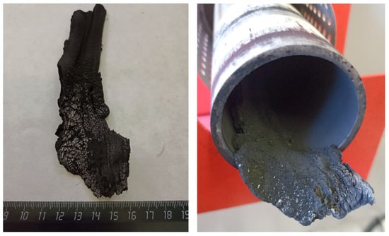 Table 3 shows the impurity composition of soot obtained in different parts of experimental plant (in reactor tube and in filter) after the pyrolysis experiment at 1200 °C and a methane flow rate of 1 L/min. Soot samples in the form of a powder, shown in Figure 8B,C, were transferred for chemical (impurity composition) analysis.