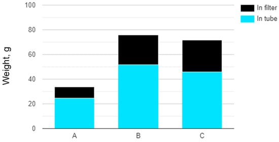 Mass of soot produced in different parts of experimental plant during methane pyrolysis depending on flow rate. A—experiment at 1200 °C and 1 L/min, B, C—experiments at 1200 °C and 5 L/min.