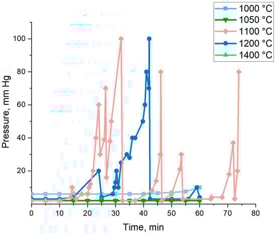 Figure 6 shows the change in pressure in the tube during the experiments. Pressure surges are caused by blockages in the pipeline between the corundum tube and the filter, the inner diameter of which is 14 mm. Soot builds up in the constriction and pressure surges are observed. After reaching a certain pressure, the bottleneck breaks through and returns to its initial state. It can be seen that at 1000 °C, 1050 °C and 1400 °C, the pressure in the tube was almost unchanged, indicating that there were no blockages at the outlet of the tube and the gas flow was free in the whole experimental setup. The greatest number of carbon plugs occurred at 1100 °C (amounting to seven), with the pressure changing by leaps and bounds due to the penetration of carbon plugs by the incoming gas flow.