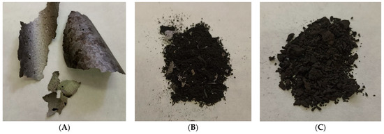 Figure 8 shows the soot obtained in the reactor tube and in the filter. Soot obtained in the reactor tube consists of a film (Figure 8A) and powder with sintered inclusions (Figure 8B). The film is what was adjacent to the inner wall of the corundum tube. The soot shown in Figure 8C was taken from the filter bag. This soot represents a fine powder without sintered inclusions.