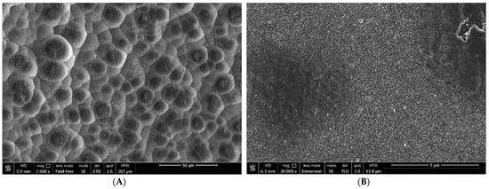 SEM images of soot sampled from a tube obtained by methane pyrolysis at 1400 °C and a methane flow rate of 1 L/min at (A) 50 µm (enlargement ×2000) and (B) 5 µm (enlargement ×30,000) resolution.