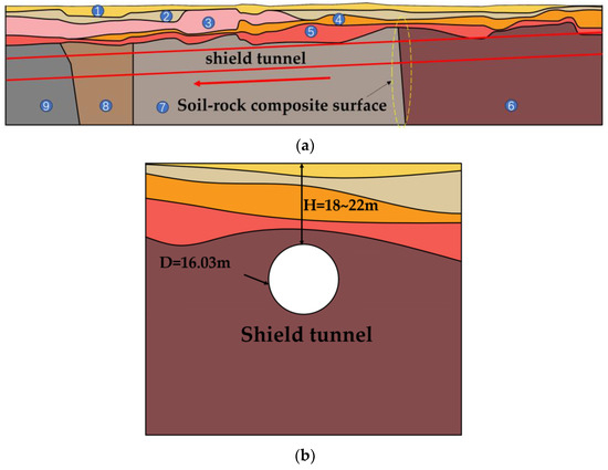 - When the shield tunnel passes through the soil–rock composite stratum, there will be large and uneven settlement near the composite interface along the direction of the shield excavation. This range is about 3.1D in the soil strata and 1.9D in the rock strata.
