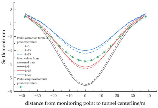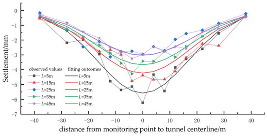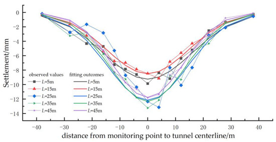 - The linear correlation coefficients (r-values) for all monitoring sections are greater than 0.8, indicating a strong correlation with the expected values from Peck’s theory. This suggests that the collected monitoring results are reliable, and the fitting curve of the Peck formula accurately reflects the actual ground settlement within the studied project area.