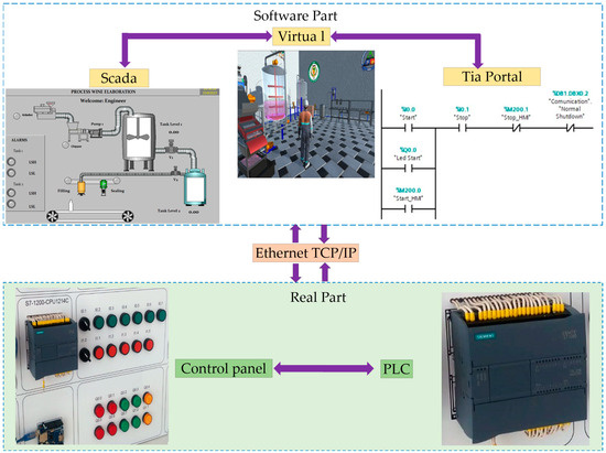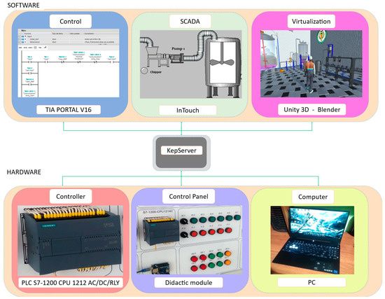 This work uses the HIL technique, which allows for bilateral communication between hardware and software. The process is controlled by three different software programs that operate simultaneously and communicate bidirectionally with the physical part, which consists of a control panel and a PLC S7-1200. The PLC was previously pre-programmed with the ladder language for the process automation. This can be visualized through KepServer (KepServer, Barcelona, Spain), which allows for real-time communication with negligible delay time. The communication architecture is shown in Figure 7.