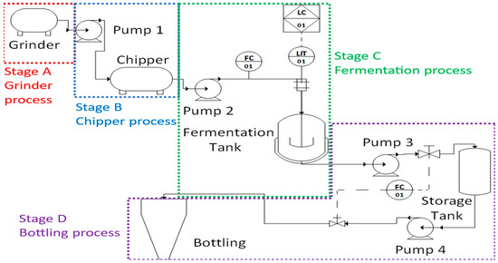 The wine process consists of four stages: (i) Crusher: The process begins with the activation of the crusher motor to extract the pulp from the grapes. When the motor is running, an indicator light (LED) turns on. The pulp is then sent through a pipe to the chipper. (ii) Chipper: The chipper has a motor that is activated when the separation of impurities, such as stems, leaves, and small stones, begins. The total pulp is then sent to the fermentation tank. (iii) Fermentation: In the fermentation tank, the pulp is mixed for a certain time and then allowed to rest to ferment. (iv) Bottling: The fermented pulp is then transferred to a storage tank. From there, it is passed through a valve to the bottling plant via a pipeline. A conveyor belt carries the bottles past a sensor, and each bottle is filled.
