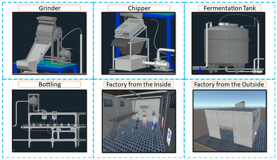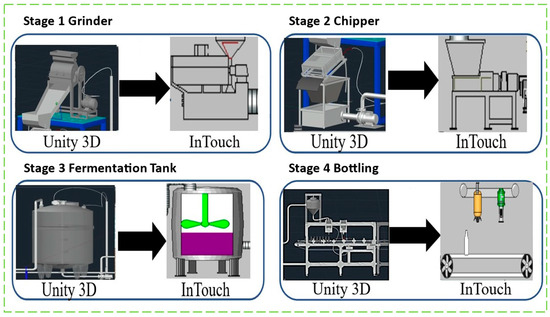 By executing the communication commands of the TIA PORTAL software and the virtualized wine plant, the two systems cooperate to carry out bilateral communication through the online connection of the software. This allows students to visualize the behavior of the process in real time. The operating stages are considered sequentially as shown in Figure 11. The process is developed in an industrial scenario typical of wine production, considering the location of the virtualized equipment so that it meets the real physical characteristics of a winemaking process. In order to create a realistic environment, different aspects are considered, such as (a) texturing of the floor, walls, and equipment to provide a user-friendly environment; (b) animation that is consistent with the operation, such as the ignition of pumps and the movement of liquids; and finally (c) sound, which represents the operation of the equipment and increases or decreases in frequency according to the user’s location.