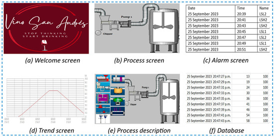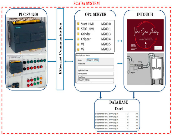 Currently, industrial processes encompass various types of procedures, including chemical, physical, electrical, and mechanical methods. Automation plays a pivotal role in manufacturing high-quality products by enabling the efficient and precise execution of these procedures. Additionally, automation crucially contributes to industrial safety by preventing accidents and adverse events that could result in equipment damage or, in extreme cases, loss of human life. This is achieved through the implementation of control and monitoring systems that regulate plant operations, thus ensuring continuous and safe functioning within specific time intervals [1,2,3]. These paradigm shifts in the industrial sector have led technological companies to increasingly adopt automation solutions as a strategy to enhance performance and efficiency in their industrial operations [4,5]. This shift in focus has resulted in a notable increase in production capacity, consequently necessitating the incorporation of advanced control technologies that enable real-time manipulation through a supervisory control and data acquisition (SCADA) system [6,7,8]. When such a system is connected with a human–machine interface (HMI), this allows the visualization and control of variables and manipulation of the process. Also, every process requires a database to store these variables, and subsequently the decisions made at the managerial level [9,10]. This interaction between the HMI and the database in the SCADA system facilitates the exchange of information about process variables in real time [10,11].