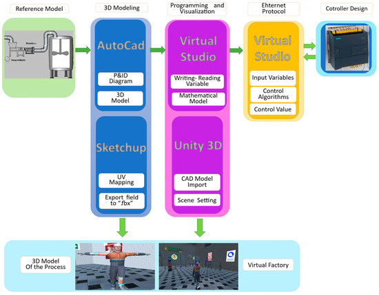 The development of the virtual environment for the winemaking process was designed based on the P&ID diagram. Figure 6 presents the phases considered for the virtualization of the winemaking process. Using the graphic design software Blender, we visualized all of the elements contained in the diagram, such as sensors, actuators, transmitters, tanks, and conveyor belts. Once the 3D environment was created in Blender, it was saved as a *.fbx file for import into Unity 3D. The *.fbx file contains all of the textures and can be found in the objects folder. To import the *.fbx file into Unity 3D, follow these steps: (1) In the Unity menu bar, click Assets > Import New Asset. (2) Find and open the *.fbx file. Once the environment is imported, you can configure the textures, add terrain, and perform other functions to make it more realistic. For animation, you must program in C++ using scripts in Microsoft Visual Studio 2019 software.