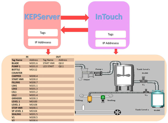 In addition, a SCADA system was developed to allow users to visualize and control the wine process. Figure 4 shows the communication of the SCADA system with the physical controller and the indicators of the teaching module. The system consists of alarms, trends, records, and data. It is made up of different elements with which users can interact. Once the winemaking process is created, addresses or tags are assigned to each element of the process (tank, engine, valve, sensor, etc.) according to the programming that was carried out in Tia Portal. This is necessary to communicate through the KepServer OPC, which must first have a channel configured. Next, communication is performed using the Ethernet TCP/IP protocol. The PLC used in Tia Portal is selected, and its default IP address of 192.168.0.1 is entered. Then, the respective tags or addresses are added. For the InTouch program, the inputs only accept tags in the form M0.0 (Start), and the outputs accept tags in the form Q0.0. Once all of the variables have been added, it is verified that there is a connection, and then the process in operation can be observed.