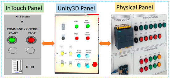In this context, three wine process control panels were developed. These panels interact with the process in real time, allowing students to manipulate the process from the physical panel, the InTouch panel, or the virtualized panel (see Figure 10). When the system is manipulated from any control panel, the system outputs information to the three programmed presentations, which are controlled by the PLC S7-1200 and communicate through the Ethernet TCP/IP protocol.