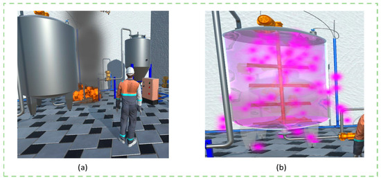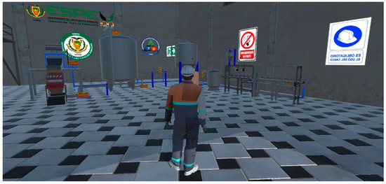 The avatar shown in Figure 14 allows the user to move through the entire virtualized plant, interact with each stage, and visualize the operation of each instrument and the behavior of the winemaking process. The avatar is important because it allows users to simulate taking control and manipulating a virtual plant. It also has the realism of an operator, with its own suit, gloves, helmet, and all the safety measures that an operator has in real life.