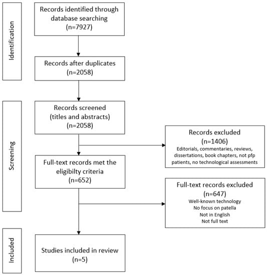 After this first step, the remaining articles were determined to be related to assessments with technology and to include PFP populations, and thus selected for the following full-text analysis. Only those articles whose full text could be accessed in English were examined. Among the suitable articles, studies using novel technology and focusing on patella-related features were retained and extracted.