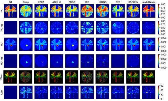 In addition to the DW images, we also computed the diffusion tensor images with the least-squares method that embedded in DIPY [36], from which the fractional anisotropy (FA), mean diffusivity (MD), and fiber orientations were derived to evaluate the denoising results in terms of diffusion metrics. FA and MD are defined by: