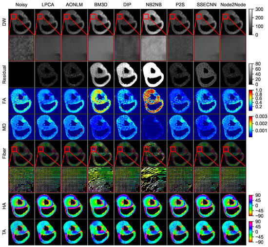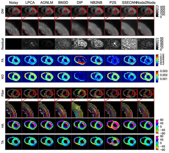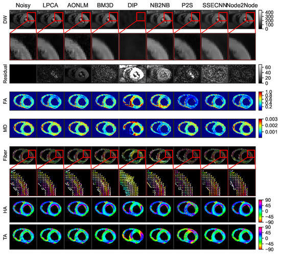 The denoised results for in the vivo cardiac DTI at the end diastole phase are shown in Figure 7. Different from the results for the systole datasets, the performance of DIP, NB2NB, and SECNN are significantly improved with the residual values of the DW images decreased, but there is still myocardium structure information in their residual maps. Although there are still singular values in their FA and MD maps, DIP can reconstruct the helical myocardium architecture from its denoised DW images. As for P2S, it achieves the worst performance, with extremely low FA values and disarranged fiber orientations. We also find that only LPCA, BM3D, and Node2Node can generate small residual values in the DW images, but the FA values derived from BM3D are little higher, and the TA maps obtained using LPCA and BM3D are worse than those of our method (a little noisy.)