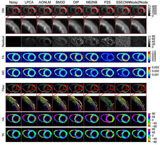 where , , and are eigenvalues of the diffusion tensor images. From the fiber orientations, the helix angle (HA) and transverse angle (TA) images were further calculated. The detailed definition can be seen in the work of Teh et al. [37]. If there are no extreme values in the FA and MD maps and the residual maps of FA and MD do not contain structure information, or if the helix angles change smoothly from positive at the endocardium to negative at the epicardium and most of the transverse angles are close to zero, the denoising result is acceptable.
