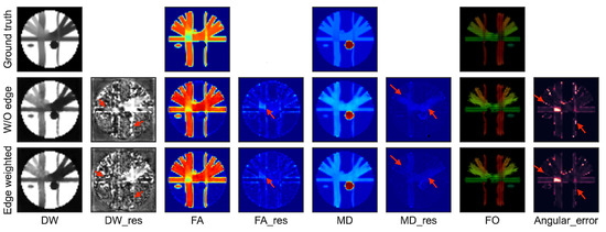 To test the effectiveness of the proposed edge-aware loss, and considering that there is a ground-truth for the synthetic dataset, we compare the denoising results of the synthetic dataset with and without edge-aware loss, as illustrated in Figure 9. It can be clearly seen that, with the help of the edge-aware loss, the residual values of the DW images and the FA and MD maps at the edge regions are obviously reduced. Moreover, the angular error between the fiber orientations and the ground-truth at the edge regions is also decreased, as indicated by the red arrows in the Figure 9.