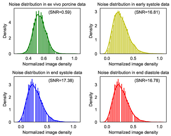 The methodologies of Neighbor2Neighbor and SSECNN are essentially different from that of DIP; they use the self-similarity of different noisy image pairs to denoise rather than the deep network prior. The Neighbor2Neighbor uses a downsampling operation to generate similar image pairs and then uses them to train the denoising network based on the Noise2Noise method, while SSECNN leverages the SSIM between the DW images along different directions to obtain these image pairs. Since the spatial resolution of all the datasets used in this work is not high enough (128 × 128 for the real dataset and 55 × 55 for the synthetic dataset), the image pairs obtained with the nearest-neighbor downsampling may be not similar enough to meet the assumptions of Noise2Noise; therefore, the performance of Neighbor2Neighbor is not satisfactory. SSECNN searches the DW image pairs by maximizing the SSIM between the noisy DW images along different directions. For the synthetic dataset, SSECNN can achieve the better results, while for both ex vivo porcine and in vivo human cardiac DTI datasets, its performance decreases dramatically. This may be caused by the differences in noise distribution among the different datasets. In the synthetic dataset, the noise conforms to the Gaussian distribution, while in the real dataset, the noise usually conforms to the Rician distribution (as illustrated in Figure 10). Rather than using the image pairs to train the network to denoise, Patch2Self uses a linear regression method to denoise. Specifically, for a given voxel along a certain diffusion direction, its clean DW signal is obtained by linearly fitting the DW signals of its surrounding neighbors along the other directions. Since the regression methods are heavily dependent on the amount of data, if the number of diffusion gradient directions or the number of slices is not enough, the bias caused by the linear regression will be significant. That is why Patch2Self performs better on the ex vivo porcine cardiac DTI dataset (30 diffusion directions, 120 slices) but worse on the synthetic (6 directions, 55 slices) and in vivo (12 directions, 1 slice) datasets.