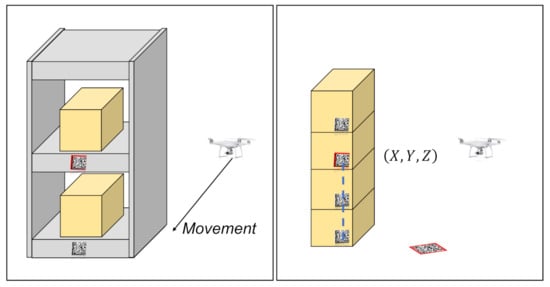 As drone technology develops, drones are being used in various fields. For inventory management automation, studies using drones have also been conducted. Cho et al. [13] proposed a framework that uses the Histogram of Gradient and Local Binary Pattern to extract the feature map of the warehouse and finally detect the two-dimensional location of QR codes by classifying them via a support vector machine (SVM). Ramaswamy et al. [14] proposed the frame stitching method for images taken with the camera mounted on a drone to obtain data by restoring the corrupted context of images taken from the indoor warehouse. Anand et al. [15] proposed a grid localization framework based on image-processing algorithms, such as thick line detection, using the drone-mounted low-cost camera for large-scale warehouse system automation. Almalki [16] proposed a remote aviation autonomous sensing model that combines radio frequency identification (RFID) sensors with drones for food safety and security. In addition, research has been conducted to estimate the relative position between RFID sensors attached to the product by mounting an RFID sensor on a drone [17]. For inventory management using drones, Cristiani et al. [18] proposed and implemented the generic architecture that scans products along a given movement path. Manjrekar et al. [19] proposed a cost-friendly solution by using a drone that scans barcodes attached to products and stores product information in the database to regularly manage inventory in warehouses. Martinez et al. [20] estimated the position of a drone using the ArUco marker attached to shelves for book inventory management. Radácsi et al. [6] proposed an inventory management model using drones that is effective for exploring shelf systems structure of the warehouse. Gubán and Udvaros [7] presented a mathematical model and a solution for a multi-user warehouse inventory using drones, relying on its own movement and the pre-planned path. In the field of drone-based inventory management automation, research was conducted based on warehouses where shelves and grids were defined. Therefore, as shown in Figure 2 (left), the position of the inventory was determined by the marker attached to the shelf. However, it is difficult to apply to the warehouse where shelves and grids are not defined, such as a storage yard. Yoon et al. [1] estimated the object 3D position using two pictures taken of four ground markers and one object marker without shelves and grids. However, it is practically difficult to put more than four ground markers in a single picture. In this study, as shown in Figure 2 (right), it was improved to use only one ground marker. Furthermore, the framework has been improved to use the video frame rather than two pictures. In addition, to improve the performance of 3D position estimation, the proposed framework includes outlier frame removal and error correction utilizing continuity of the video frame.