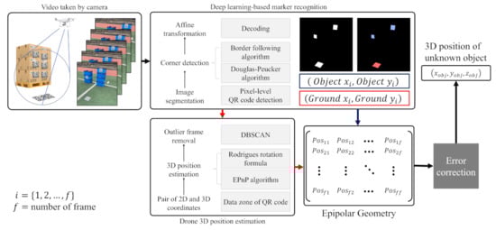The vision-based position estimation technology is divided into feature point-based position estimation in the environment and marker-based position estimation [8]. Feature point-based position estimation has the advantage of being able to be used without additional work, such as attaching markers for application to the environment. However, its limitations are that complex operations for feature point recognition are required and that the application is limited in spaces with fewer feature points [9]. On the other hand, marker-based position estimation is not significantly affected by spatial characteristics. Recently, the drone-based inventory management automation method using the recognition of markers attached to inventory, such as barcodes and quick response codes (QR codes), has been proposed. Markers attached to shelves, floors, and walls guide the current position and movement path of a drone. For the inventory management of the warehouse, the drone moves along the guided route and scans the markers attached to the inventory. In the case of an indoor warehouse, the storage area of the inventory is clearly divided in the 3D space using shelves and grids. The position of the marker attached to the inventory may be specified using the information of the markers attached to shelves and grids in the same frame. However, in a storage yard without shelves and grids, the storage area of the inventory is not clearly classified. In other words, in a storage yard, the storage area of the inventory is flexible. In particular, it is difficult to obtain the height of the location where the inventory is stored in a warehouse without shelves. Most often, inventory management studies using drones have been conducted in warehouses with shelves and grids [6,7]. Therefore, 3D positional estimation of inventory, including height, is necessary for inventory management automation in a storage yard. The inventory 3D position should be able to be estimated using the video of the warehouse or storage yard taken by a drone along the path of movement. Therefore, a method for 3D position estimation in the video frame is required. To solve this, a framework is proposed for 3D position estimation of the inventory QR code attached to the inventory in the video frame, using the ground QR code attached to the floor and the drone-mounted monocular camera, as shown in Figure 1. The proposed framework does not require shelves and grids for 3D position estimation of inventory. Furthermore, if drones could capture the QR code regardless of the presence of shelves and grids, the proposed framework is available in warehouses or storage yards with and without shelves and grids. Furthermore, a method for error correction of the estimated inventory 3D position in the video frame is proposed. The segmentation model [10] was trained to detect the area of an object in an image. Then, the QR code area was detected from the video frame. The dataset for segmentation model learning was generated by synthesizing the QR code with size, rotation, and perspective distortion in the background image [11]. The generated dataset was used to fine-tune the segmentation model pre-trained with ImageNet [12]. Decoding is performed after detecting the QR code area in the video frame with the fine-tuned segmentation model and correcting the QR code distortion. In the case of ground QR codes as a result of decoding, the drone’s 3D position is estimated using the 3D positional information stored in the QR code. Furthermore, the 2D coordinates of the QR code is detected from the image. An equation of a straight line in 3D space passing through the inventory is derived from a drone’s position at the time of frame shooting estimated through the ground QR code and the 2D coordinates of the inventory QR code detected in the image. After deriving equations of the straight line from all the video frame, frames in which the estimated drone position were determined to be outliers are detected. Then, the outlier frames are removed to minimize errors in 3D inventory position estimation. The inventory 3D position was estimated with pairs of straight lines derived from the video frame other than the outliers. Finally, the 3D position estimation result of the inventory is corrected using the angle between the straight pairs. The proposed framework consists of deep-learning-based QR code recognition, drone 3D position estimation, outlier frame removal, inventory 3D position estimation, and error correction. Deep-learning-based QR code recognition shows that a high level of marker recognition is possible by combining the segmentation model and the computer vision algorithm. Outlier frame removal and error correction shows the relationship between the angles between epipolar lines and the estimated inventory 3D position. It also shows that it is possible to correct the estimated 3D position error using this relationship. The contributions of our study can be summarized as follows: