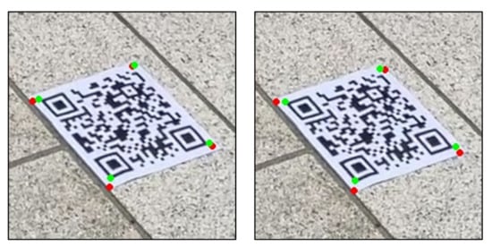 The QR code attached to the floor and inventory is square, but perspective transformation occurs due to the photographed angle. To perform decoding by correcting the perspective transformation, four vertices of the detected QR code area are required. However, since the edge of the detected QR code contains noise, unlike the actual edge, the edge is approximated as a square using the Douglas–Peucker algorithm [49]. The approximation level of Douglas–Peucker algorithm is determined by a predefined epsilon. In this paper, the epsilon is set to 2% of the outline length. It is assumed that the ground QR code has information on the 3D position, while the inventory QR code has only information on the inventory, but not position. The type of detected QR code is determined as a result of decoding. In addition, the vertex of the data zone corresponding to the inside of the green line in Figure 4 was obtained through decoding, while the orientation of the QR code was obtained using the alignment pattern corresponding to the inside of the red line in Figure 4.