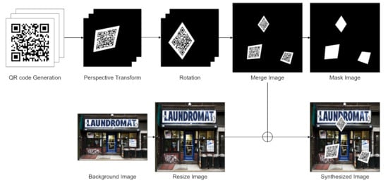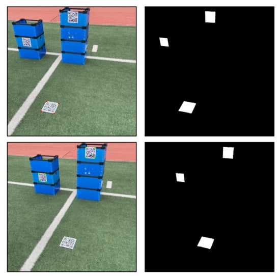 When photographed with the drone-mounted monocular camera, the QR code attached to the floor and product is distorted, due to perspective transformation. Accordingly, the segmentation model should be able to detect the QR code in which distortion due to perspective transformation occurs in the video frame. We generated the train dataset of the segmentation model to detect QR code for which perspective transformation had occurred. The QR code is generated based on the Reed–Solomon code, which has the ability to restore images, even if some areas are missing or damaged. There are four levels of error recovery: L, M, Q, and H. The H with the best recovery performance can recover up to 30% of misses and losses. Warehouse, the inventory management space to use the QR code as the marker, is an environment where the QR code is prone to contamination and damage. Therefore, in this study, the experiment was performed using the QR code of the H level. The QR code generated in the form of square was randomly resized, perspective transformation was applied, and it was rotated randomly within . In order to apply the perspective transformation that can occur in reality, we adjusted the degree of distortion so that the order of the QR code vertices does not change.