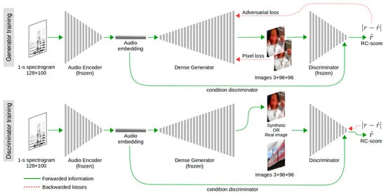 Here we define a set of spectrogram–embedding–image data triples , consisting of spectrograms , audio feature vectors , and real-color images , in which each element of the triple corresponds to the same acoustic event. All the real numbers are limited to the interval , since pixel values are normalized to the mentioned range before entering the network, and audio embeddings, as well as the realness-and-coherence score (RC-score) , both activated by TanH, fit the same interval. Regarding dimensions: and are, respectively, the height and width of spectrograms or images, is the number of channels of color images, and is the dimensionality of the audio feature space. The audio encoder and the audio decoder are defined, respectively, as the transformations and . From the side of the adversarial networks, the generator and the discriminator are defined, respectively, as and , where denotes the real image that is entered into the discriminator, alternating with the synthetic image from .