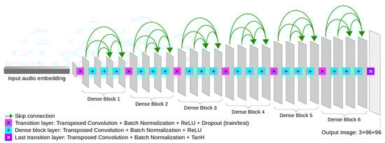 Regarding the generator architecture, a notable improvement over the baseline S2I translator was achieved by employing a deeper 25-layer architecture, especially when applying “skip connections” to make a dense generator. This final architecture draws inspiration from DenseNet [] (Figure 3). Compared to the initial 13-layer sequential generator, which resembles the audio decoder in structure, the new deeper and denser architecture allows for a substantial improvement in the quality of the generated images. The convolutional layers of the generator are followed by BN and ReLU activation, except for the output layer, which employs TanH. Additionally, we include dropout regularization between each dense block to improve model generalization, as well as to prevent deterministic inference through its application also at test time, as utilized by Gal and Ghahramani [] and Isola et al. [].